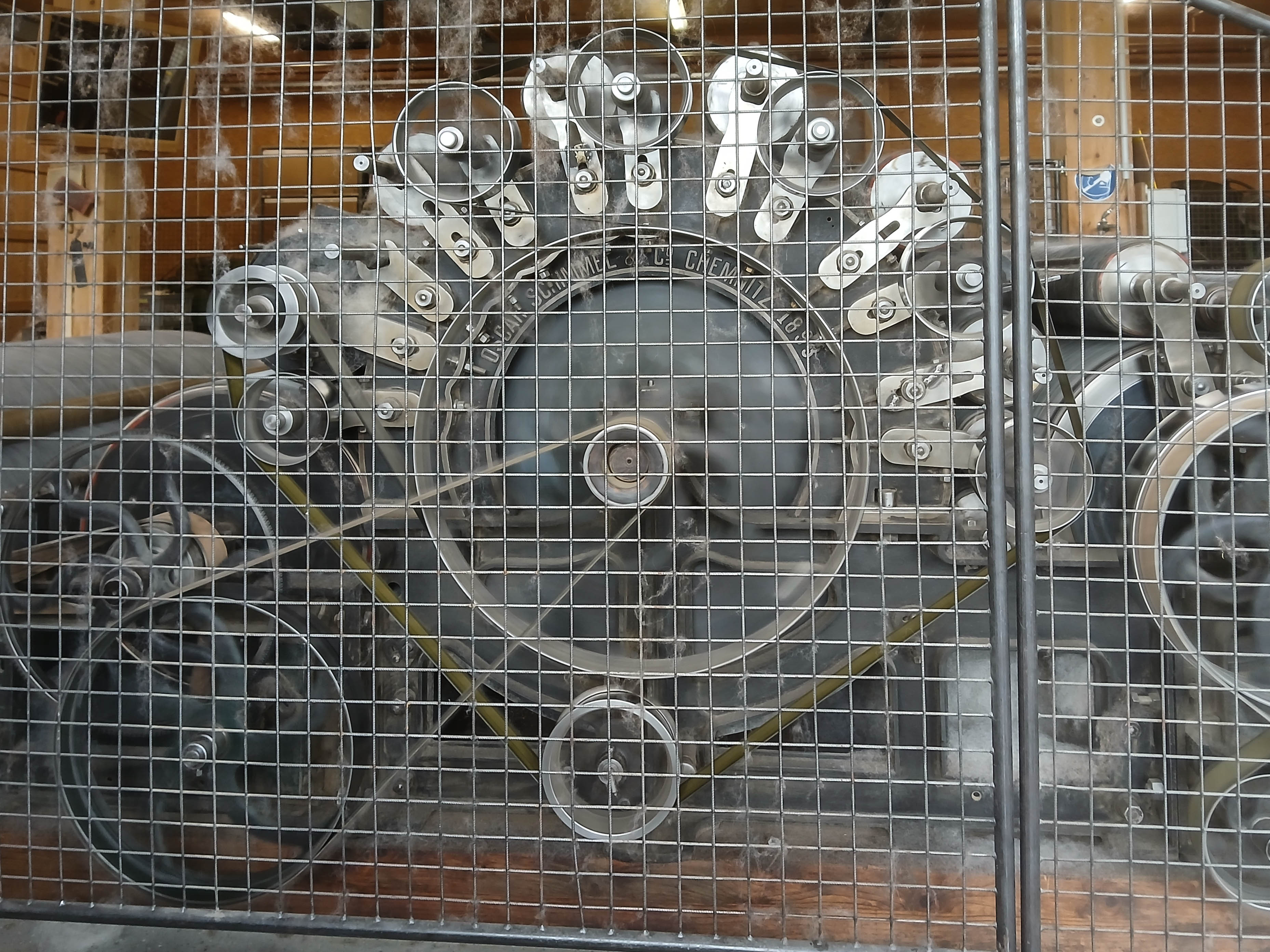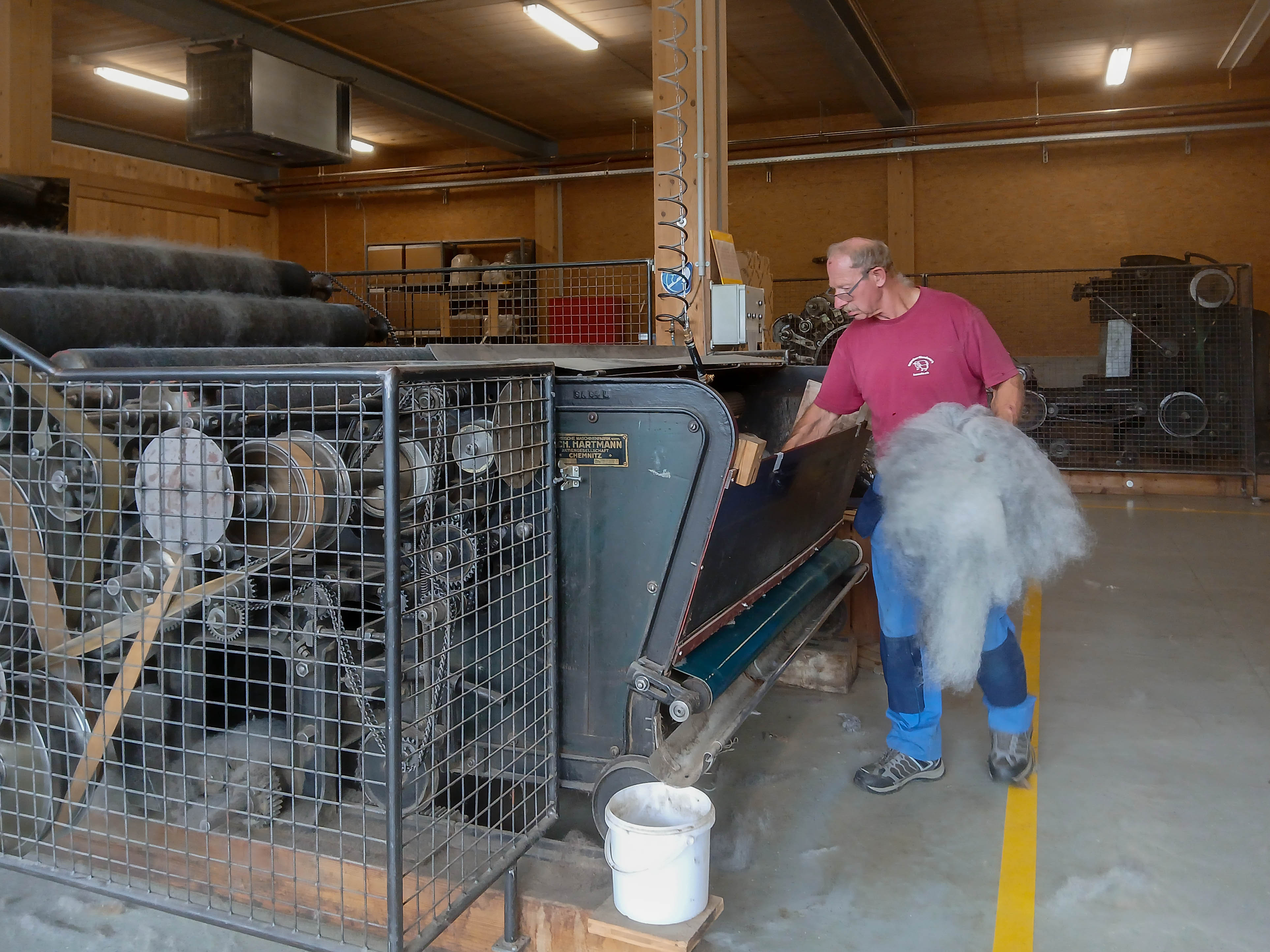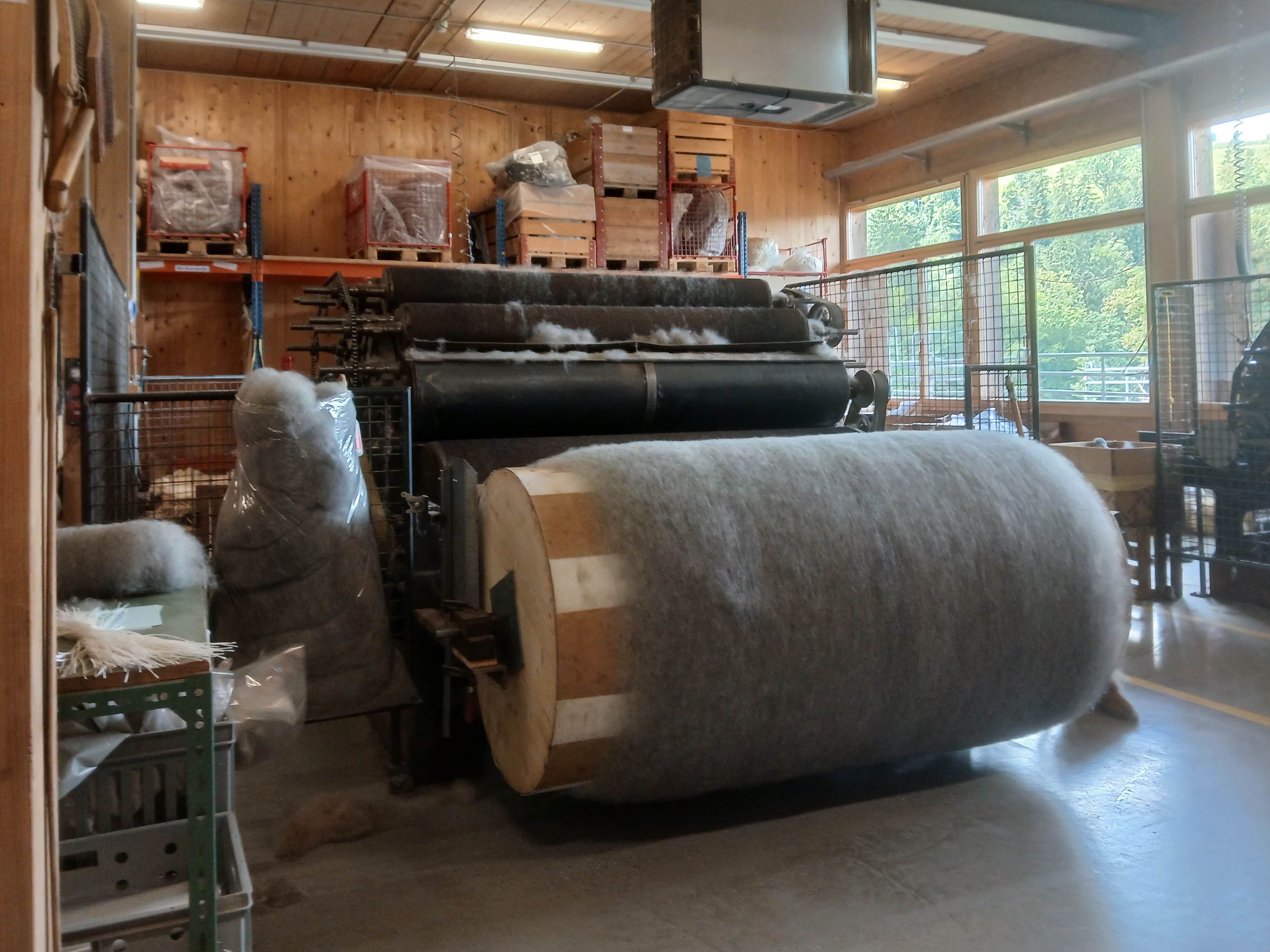Die Roh-Wolle wird nach mehreren Waschgängen in diesen Maschinen gekämmt bzw. gekardet und zu einem Vlies verfilzt.