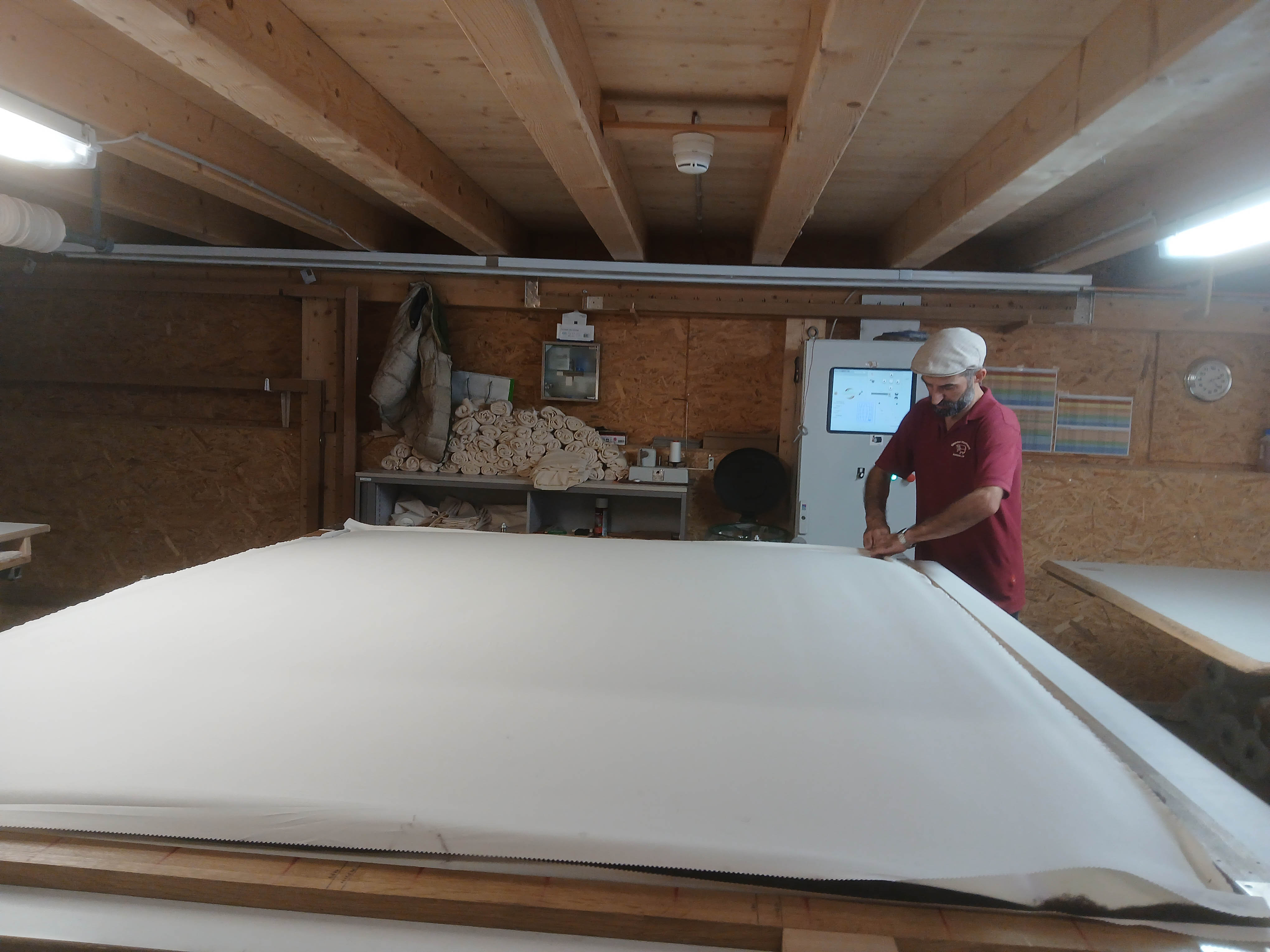 Hier wird zwischen gespannten Tüchern eine Schicht Wollvlies vorbereitet und anschliessen automatisch in Karoform abgenäht und gesäumt. So entstehen die wertvollen Bettdecken.