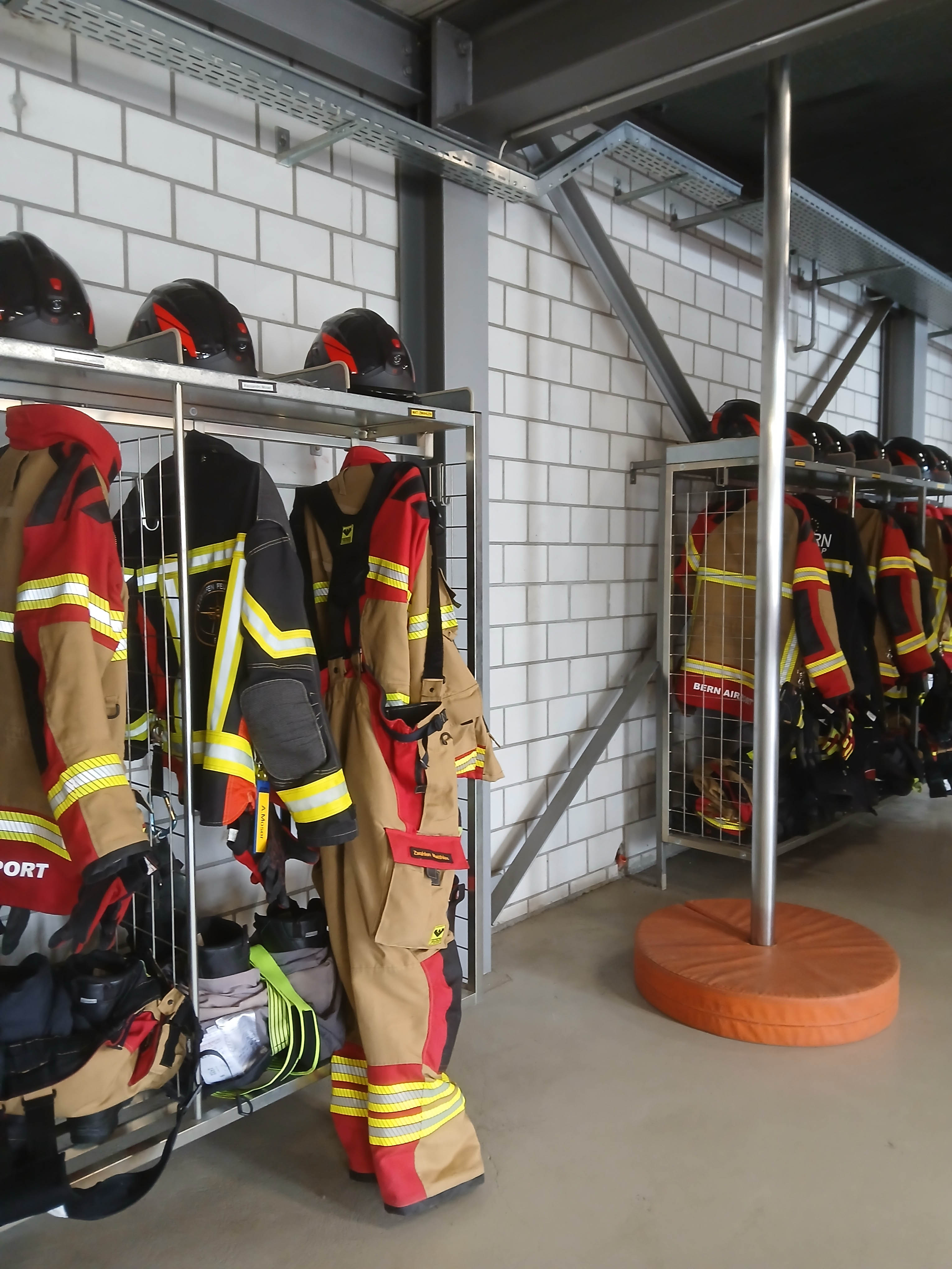 Innert höchstens drei Minuten muss die Feuerwehr am Einsatzort sein. Deshalb braucht es flinke Männer, die bei Alarm vom Aufenthaltsraum oben an der Stange herunterrutschen, in den Schutzanzug mit Stiefeln und Helm springen, ins Auto steigen und die Strecke bis zum Pisten-Ende fahren. Das wird jährlich getestet und beim Nichterreichen droht der Lizenzverlust für den Flughafen.