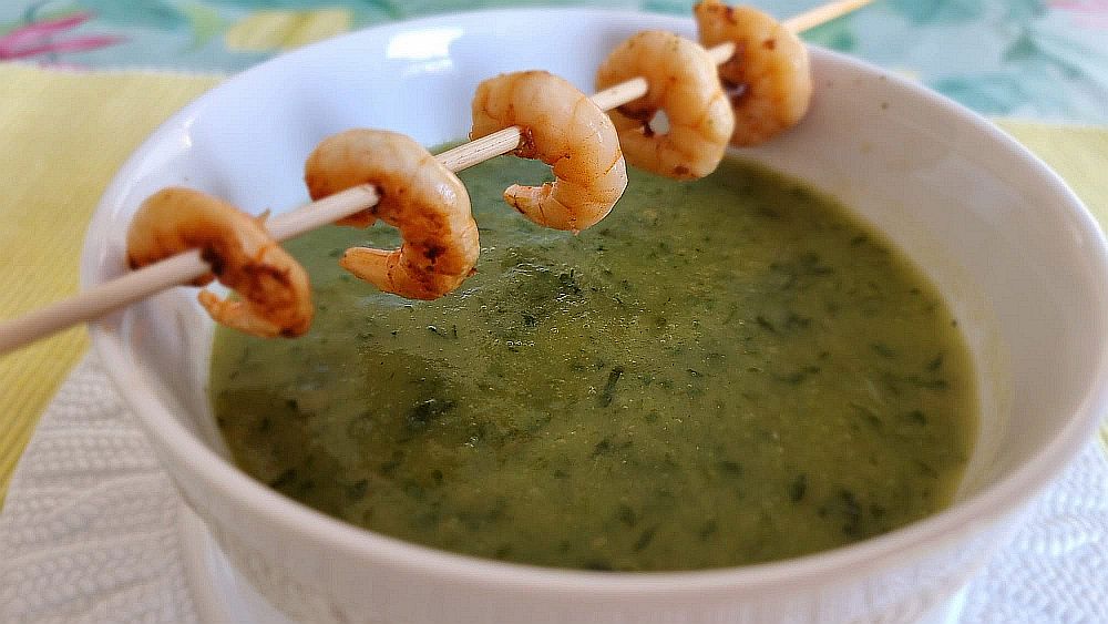 Einige Kartoffeln, etwas Kohlrabi oder ähnliche Gemüse aber keine Roten! In etwas Boullion weich kochen, würzen mit RAS EL HANOUT. Mit dem Mixstab fein pürieren. Jetzt einige Blätter Bärlauch (je nach Gluscht wie „lauchig“ es sein darf) dazu geben und nochmals mixen. Ein kleines Gütschli Rahm macht die Sache noch geschmeidiger. Es entsteht eine wunderbare Frühlingsgrünfarbe. Einige geröstete Mandelblättchen schwimmmen gerne darin. Und als Tüpfchen, nein nicht uf dem I sondern auf einem Holzstäbchen schweben kurz gebratene Crevettchen über dem Grün.