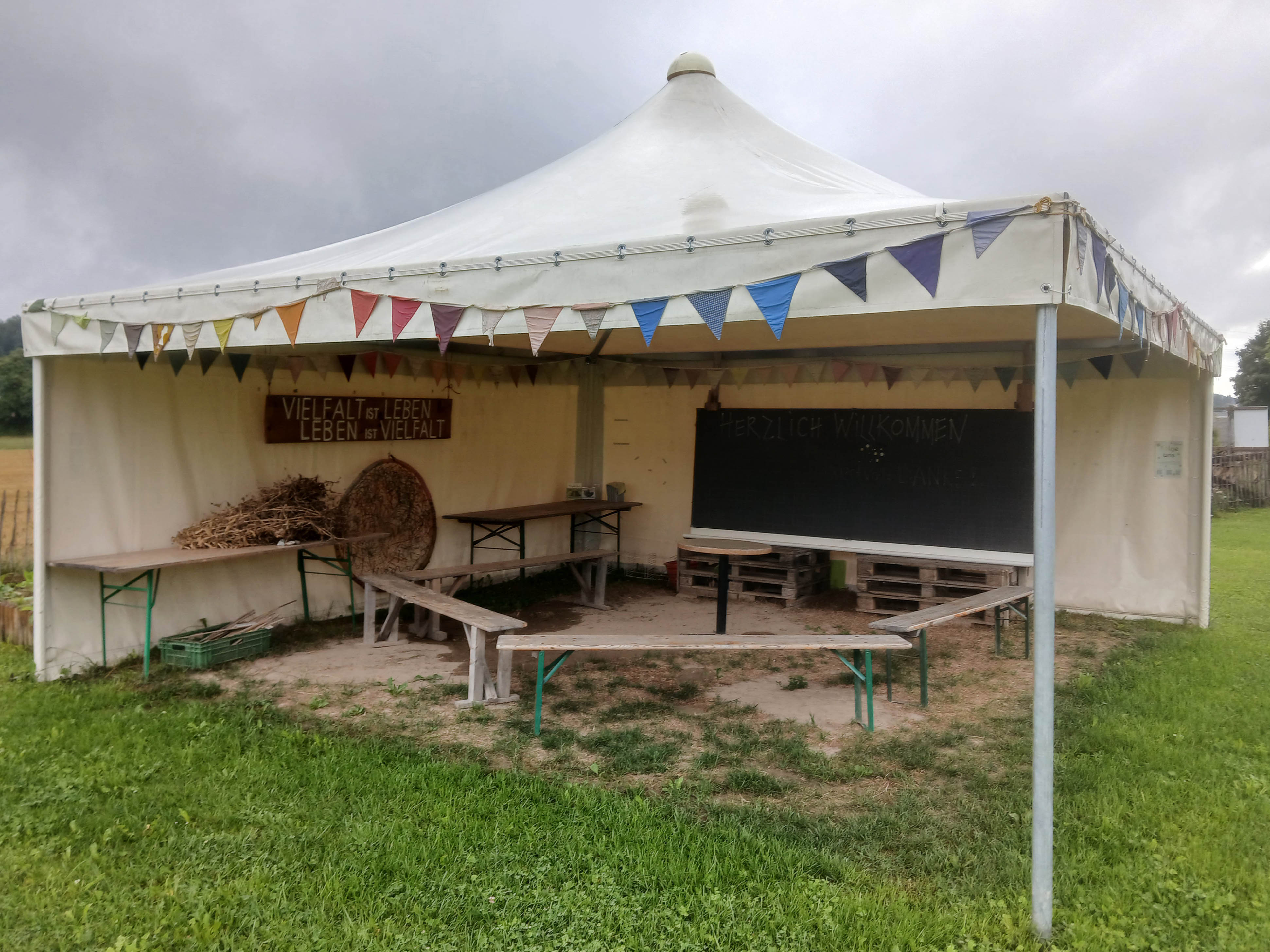 Unter dem Zelt beginnt die Führung mit grundlegenden Erklärungen.